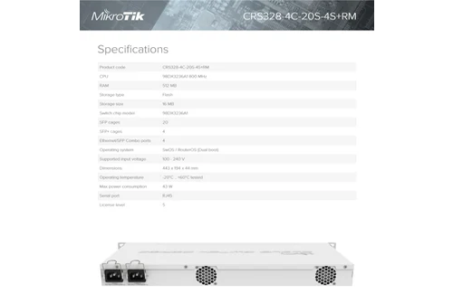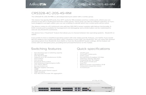 The CRS328-4C-20S-4S+RM is a 28 independent port switch with a combo group. This device has twenty SFP ports, four SFP+ ports for 10G modules and four combo ports, where you can choose to use SFP or RJ45 ports from the combo group. These ports can also be software selected, so if you have plugged in all eight cables, you can use scripting, to decide which four combo ports will be active.
